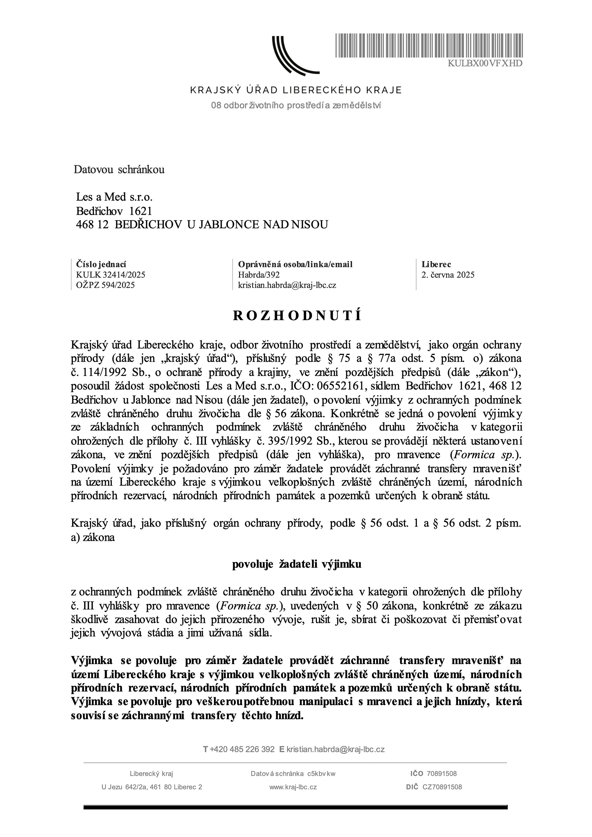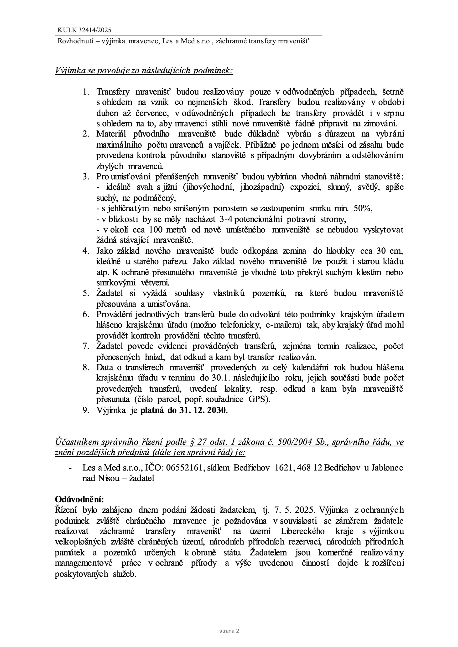 Transfery realizujeme na základě výjimky (KULK 32414/2025, OŽPZ 594/2025) udělené Krajským úřadem Libereckého kraje – odborem životního prostředí a zemědělství, v souladu s platnou legislativou ochrany přírody.